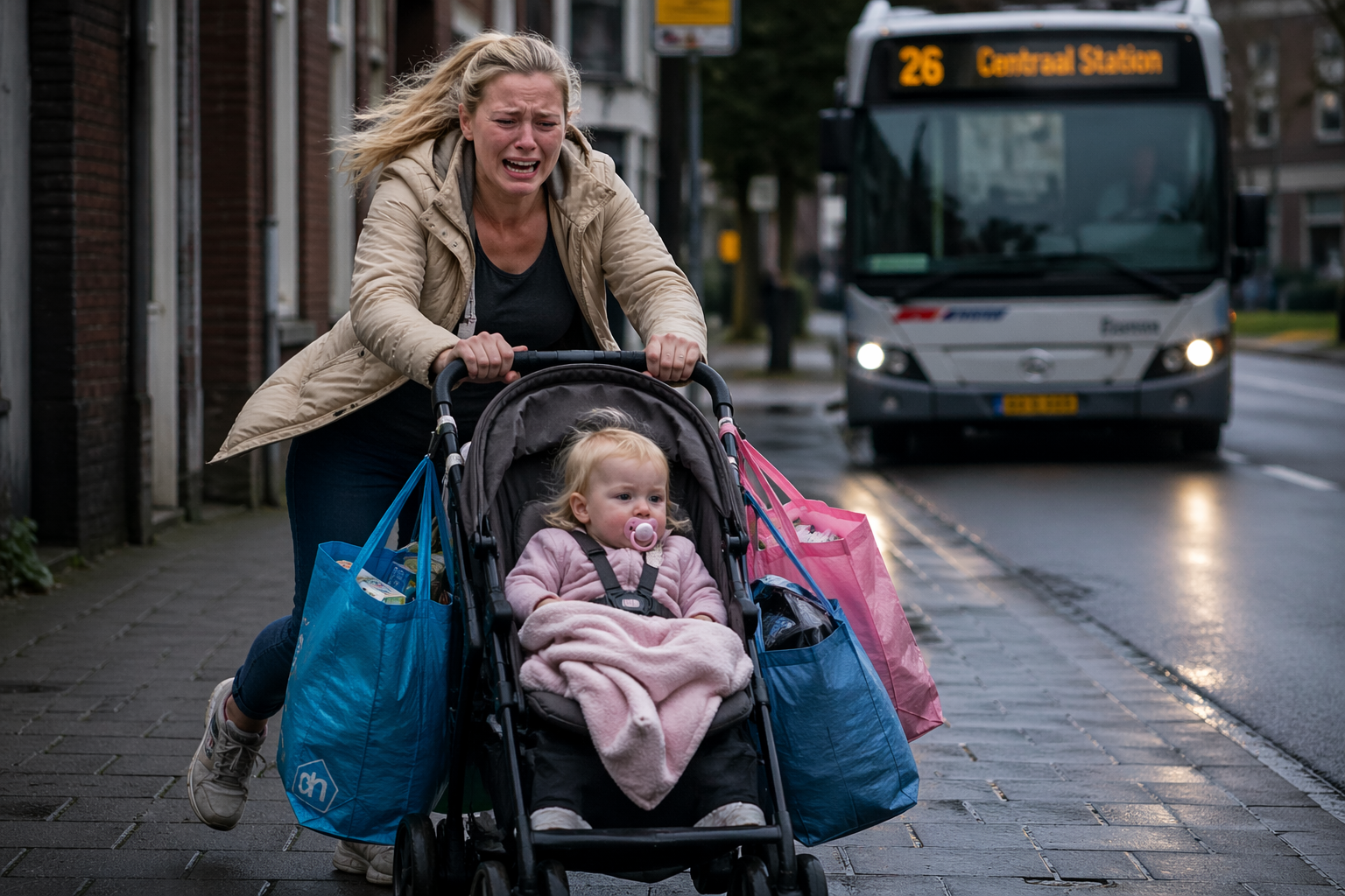 Ik greep de buggy en rende. Ik zag de bus al aankomen. Ik huilde terwijl ik rende. Mijn hele lichaam schreeuwde. Als ik deze bus mis… ben ik verloren. De buschauffeur zag me. Hij stopte. Nog vóór de halte. Hij zei niets. Vroeg niets. Hij hielp me naar binnen en reed meteen weg. Hij stopte nergens meer. Alsof hij voelde dat dit geen gewone rit was.